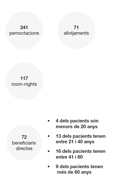 La Fundació Jubert Figueras disposa d’onze pisos, a prop dels grans hospitals de referència de la ciutat i àrees d’influència de Barcelona, Badalona i L’Hospitalet. Les famílies són derivades des de les Unitats de Treball Social dels hospitals. S’ha ofert allotjament a més de 1500 famílies, que han pogut descansar en un llit després de passar el dia a l’hospital, acompanyant a un familiar malalt. Donada la gravetat de les patologies que es deriven als hospitals terciaris, les estades solen ser llargues, amb una mitjana de 41 dies per família als pisos. S’ofereixen més de 9000 pernoctacions (room/nights) cada any. (Dades extretes de la Memòria 2021).